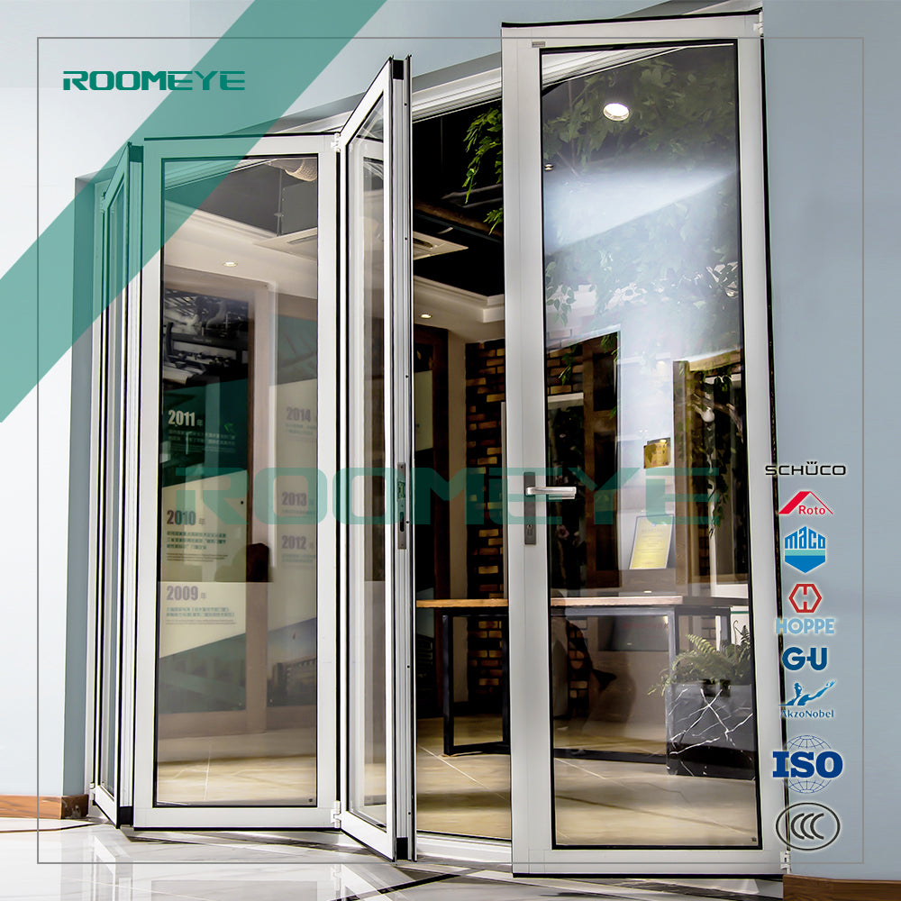 Aluminium balcony outdoor bi-fold door modern design glass folding dooror Products ROOMEYE ALUMINIUM THERMAL BREAK SERIES Aluminium balcony outdoor bi-fold door modern design glass folding door with good air tightness, water-proof, sound insulation, thermal insulation. Solid wood veneer available for the inside view as your prefer. Different opening types, casement, tilt&turn,...