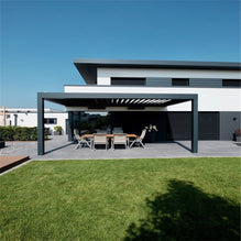 Type:Arches, Arbours, Pergolas & Bridge Place of Origin:Guangdong, China Metal Type:Aluminum Feature:Easily Assembled, ECO FRIENDLY, Renewable Sources, Waterproof Material:Extruded Aluminum Alloy (6063-T5) Color:grey, white, black or customized Size:grey, white, black or customized Surface treatment:powder coated Warranty:10 years Operation:Motorized (remote Control) Sensor system available:Rain Wind Sensor Application:Dining/Bar/Relaxation/Swimming pool etc. Wind load...
