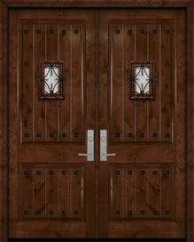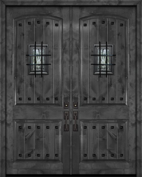 WDMA 84x96 Door (7ft by 8ft) Exterior Knotty Alder 42in x 96in Double Arch 2 Panel V-Grooved Estancia Alder Door with Speakeasy / Clavos