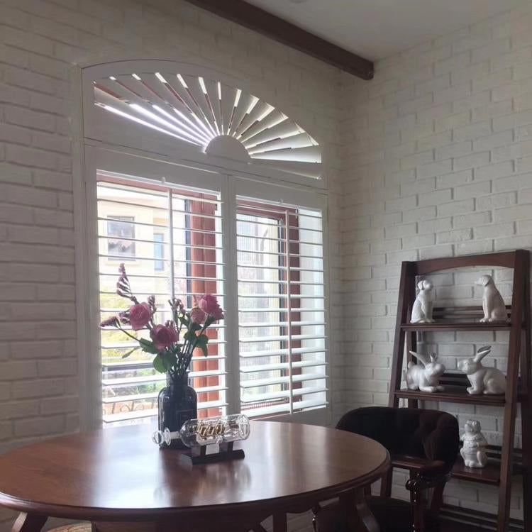 Product Description 2019 white Arch Design Interior Wooden Window plantation shutter     About shutters: plantation shutter is an investment in your home. For centuries, shutters have been prized as fine window furniture and a testament to a homeowner's discerning style and sophistication. Shutters not only provide design, privacy and...