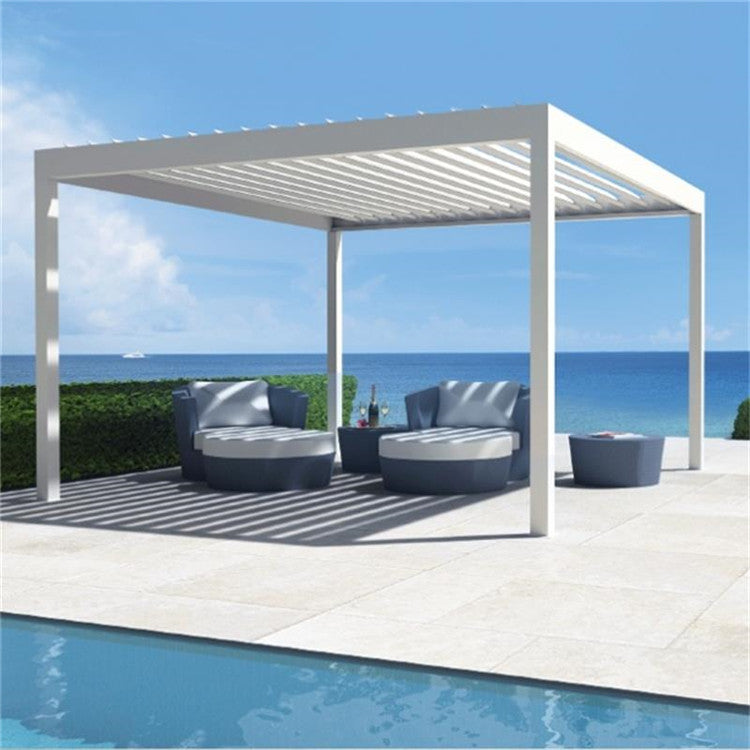 Type:Arches, Arbours, Pergolas & Bridge Place of Origin:Guangdong, China Metal Type:Aluminum Feature:Easily Assembled, ECO FRIENDLY, Renewable Sources, Waterproof Material:Extruded Aluminum Alloy (6063-T5) Color:grey, white, black or customized Size:grey, white, black or customized Surface treatment:powder coated Warranty:10 years Operation:Motorized (remote Control) Sensor system available:Rain Wind Sensor Application:Dining/Bar/Relaxation/Swimming pool etc. Wind load...