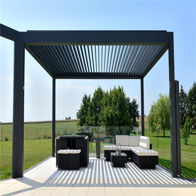 Type:Arches, Arbours, Pergolas & Bridge Place of Origin:Guangdong, China Metal Type:Aluminum Feature:Easily Assembled, ECO FRIENDLY, Renewable Sources, Waterproof Material:Extruded Aluminum Alloy (6063-T5) Color:grey, white, black or customized Size:grey, white, black or customized Surface treatment:powder coated Warranty:10 years Operation:Motorized (remote Control) Sensor system available:Rain Wind Sensor Application:Dining/Bar/Relaxation/Swimming pool etc. Wind load...