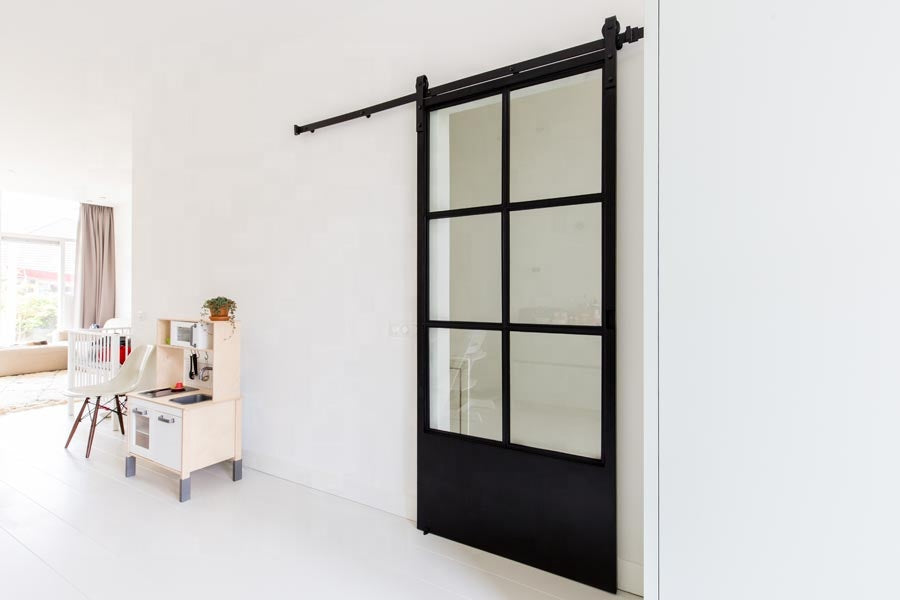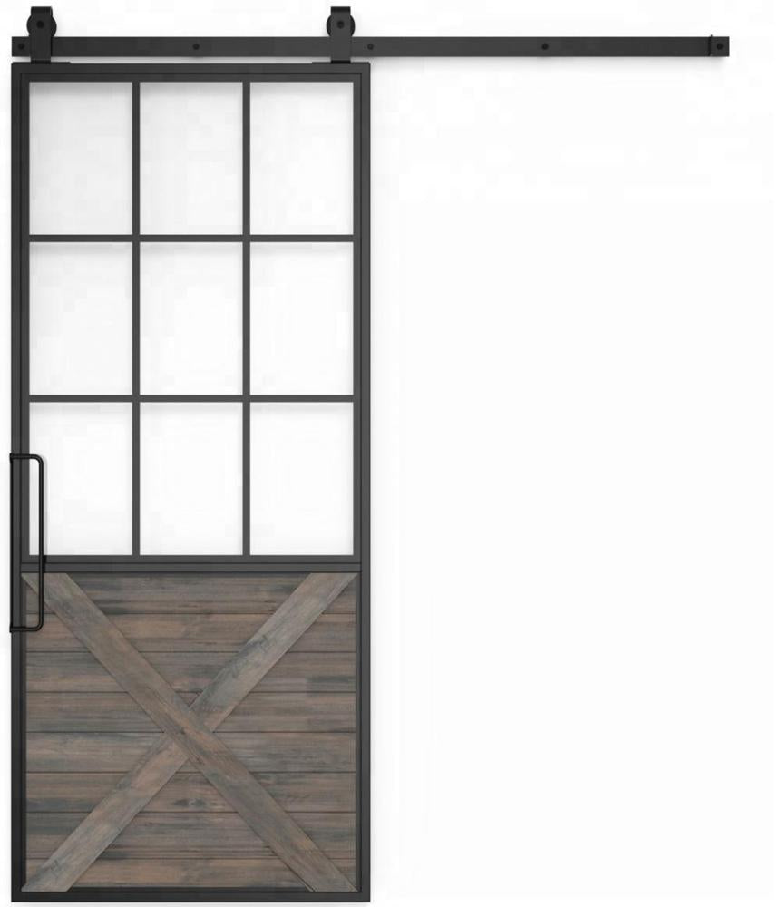 French Style Black Carbon Steel Sliding Frosted Glass Black Frame Barn Door with Soft Close on China WDMA