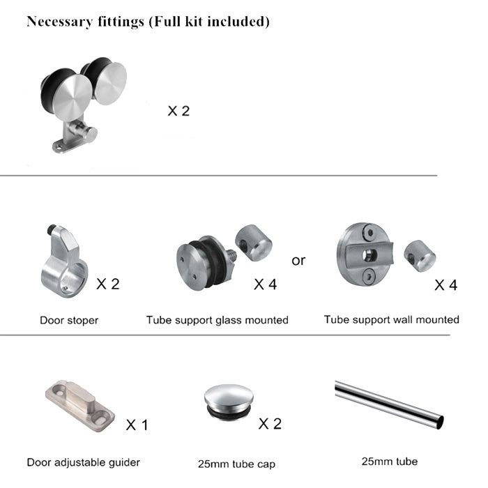 Barn Door Hardware Wooden Frame Sliding Mirror Doors For Bathrooms Product Description PRODUCT INFORMATION Model SLD-W-02 SET Material Stainless Steel 304 Surface Polished or Stain Glass thickness 30-50mm Door type Frameless wooden Door Door width 1500MM Max. Door weight 200kg PRODUCT DISPLAY PRODUCT...