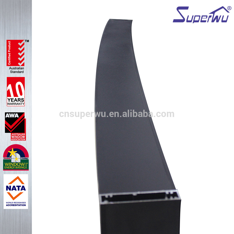 Commercial system black curved aluminium sliding window Product Description Profiles 6063-T5 high quality thermal break aluminium profile, thickness 2.0 mm 6063-T5 high quality non-thermal break aluminium profiles, thickness 2.0 mm PVC/UPVC profiles Glass Double toughened glazing:5mm+12A+5mm (A:Air);5mm+12A+5mm tinted; 5mm+12A+5mm Low-E; 5mm+27A+5mm Single toughened glazing: 3/4/5/6/8/10/12/15/19/21//6.38/11.76mm Laminated glazing: 5mm+0.76+5mm, 5mm+0.38+5mm Hardware German brand: Roto,...