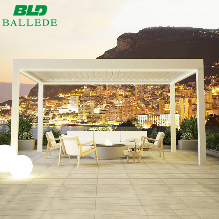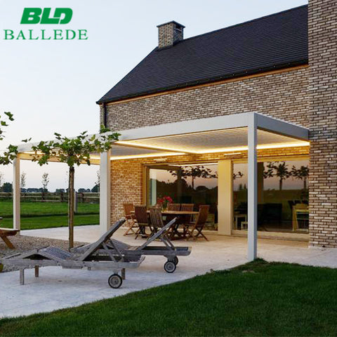 Product Description         Material Aluminum alloy 6005 T5 Blades 200*35*2.0mm / 205*50*2.2mm Gutters 100*65*2mm Beams 180*70*2.5mm / 200*70*3mm Posts 126*126*2.5mm / 150*150*3mm Motor  Grade IP67 with UL & CE certificate Finish Powder Coated / PVDF match any RAL color Drainage Hidden Drainage System Optional Accessories Side curtains/LED Light/Wind...