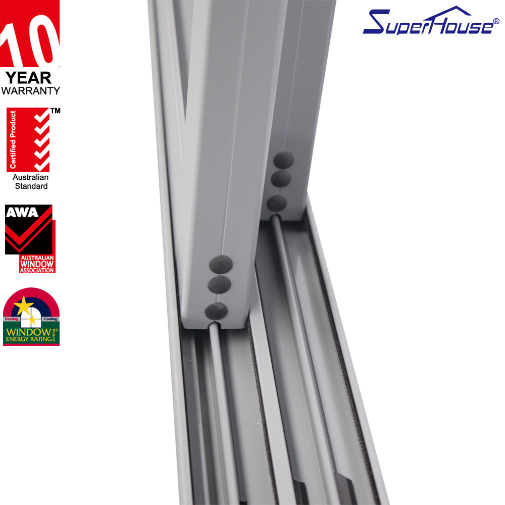 Product Description Name/Model: SPA100 commercial system Standard/Certificate: comply with AS2047 Glass Standard: Comply with AS2208 & ANSIZ97.1 Extrusion alloys: 6063-T5 profile Hardware: Australia doric with 10 years warranty Surface finish: powder coated meet AS 3715, Electrophoresis,flucarbon,Anodizing,or wood color Glass choice: 5+12A+5 mm Low-e; relective;Frosted Flyscreen: Fiberglass flyscreen Function: Waterproof,Soundproof,Energy efficient...