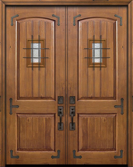 WDMA 64x96 Door (5ft4in by 8ft) Exterior Knotty Alder 96in Double 2 Panel Arch V-Groove Door with Speakeasy / Corner Straps